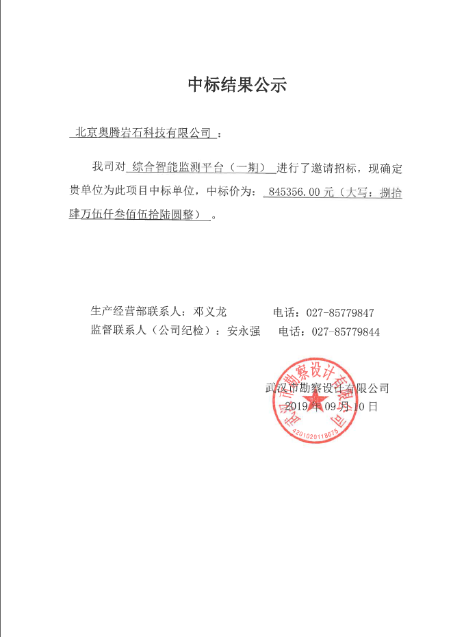 武漢市勘察設(shè)計有限公司綜合智能監(jiān)測平臺(一期)中標(biāo)結(jié)果公示