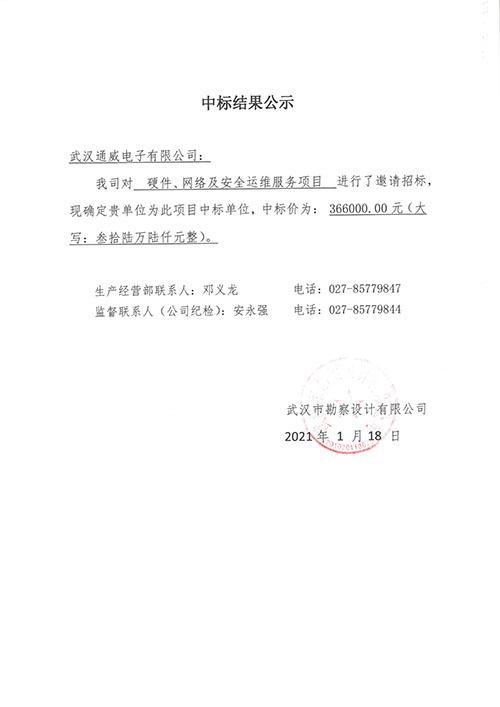 武漢市勘察設計有限公司硬件、網絡及安全運維服務項目中標結果公示