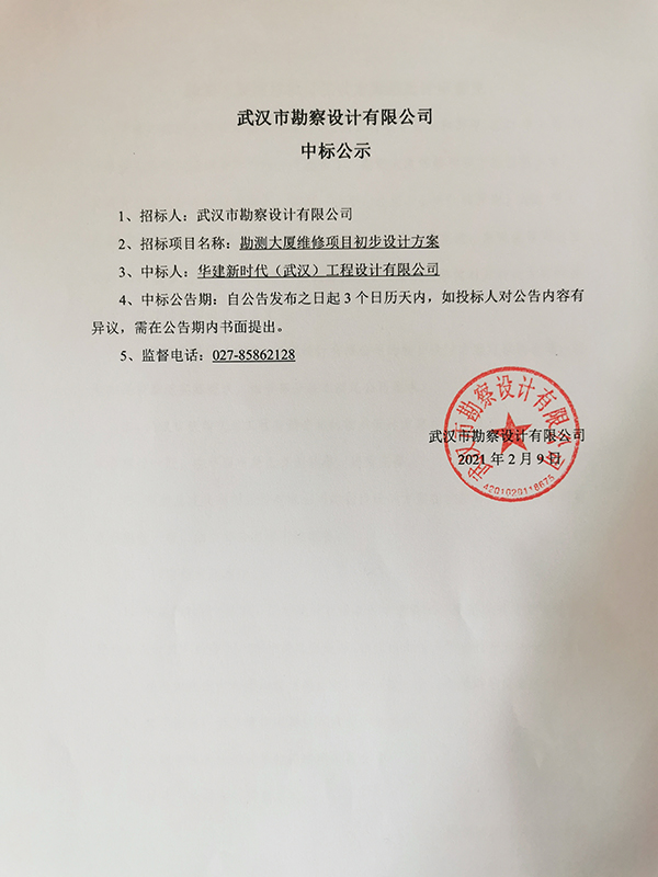 武漢市勘察設(shè)計(jì)有限公司勘測(cè)大廈維修項(xiàng)目初步設(shè)計(jì)方案中標(biāo)結(jié)果公示