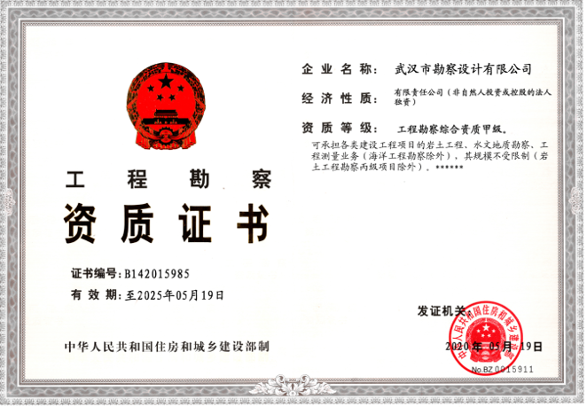 2020年5月19日,我司工程勘察綜合資質甲級延期申報材料順利通過國家住房和城鄉建設部的最終審核,獲準延期,取得了國家住建部頒發的工程勘察綜合資質甲級新證,為我司今后能夠順利承接各類建設工程項目的巖土工程、水文地質勘察、工程測量業務等提供了有力的保障。