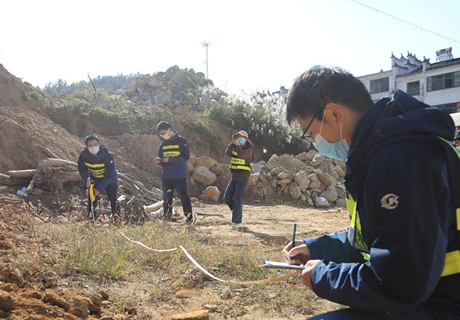 此次演練活動模擬了在強(qiáng)降雨天氣影響下,發(fā)現(xiàn)黃陂區(qū)蔡店街張家大灣某居民房屋后邊坡失穩(wěn),存在滑坡險(xiǎn)情,情況十分緊急。險(xiǎn)情發(fā)生后,自然資源、應(yīng)急管理部門及勘察公司協(xié)同街道、鄉(xiāng)村一起密切配合、分工協(xié)作,組織應(yīng)急隊(duì)伍有效應(yīng)對,并迅速開展地質(zhì)災(zāi)害應(yīng)急救援工作,演練具體內(nèi)容包括地質(zhì)災(zāi)害氣象風(fēng)險(xiǎn)預(yù)警、網(wǎng)格專管員開展巡查監(jiān)測、地質(zhì)災(zāi)害險(xiǎn)情上報(bào)、地質(zhì)災(zāi)害應(yīng)急響應(yīng)、應(yīng)急隊(duì)伍實(shí)施救援、邊坡雷達(dá)監(jiān)測預(yù)警、無人機(jī)偵測和救援等演練科目。