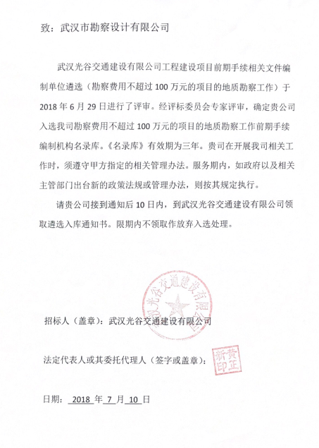 2018年6月29日,經(jīng)投標(biāo),我公司成功入選武漢光谷交通建設(shè)有限公司“勘察費(fèi)用不超過100萬元的項(xiàng)目地質(zhì)勘察工作”,服務(wù)期限為三年。